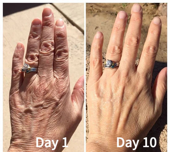 En 10 jours à peine, mes mains sont redevenues lisses, fermes, sans taches. Ma bague de fiançailles semble avoir retrouvé son éclat, tant ma peau paraît rajeunie ! Fini l’aspect fripé. Tout est plus ferme, tonique, net.